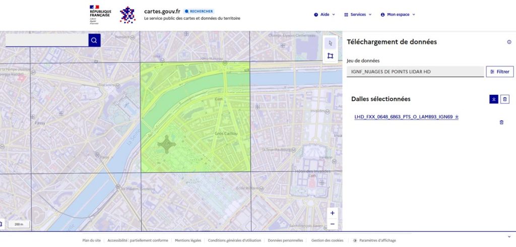 Haz zoom sobre París y descarga el conjunto de datos que incluye la Torre Eiffel: LHD_FXX_0648_6863_PTS_O_LAMB93_IGN69.